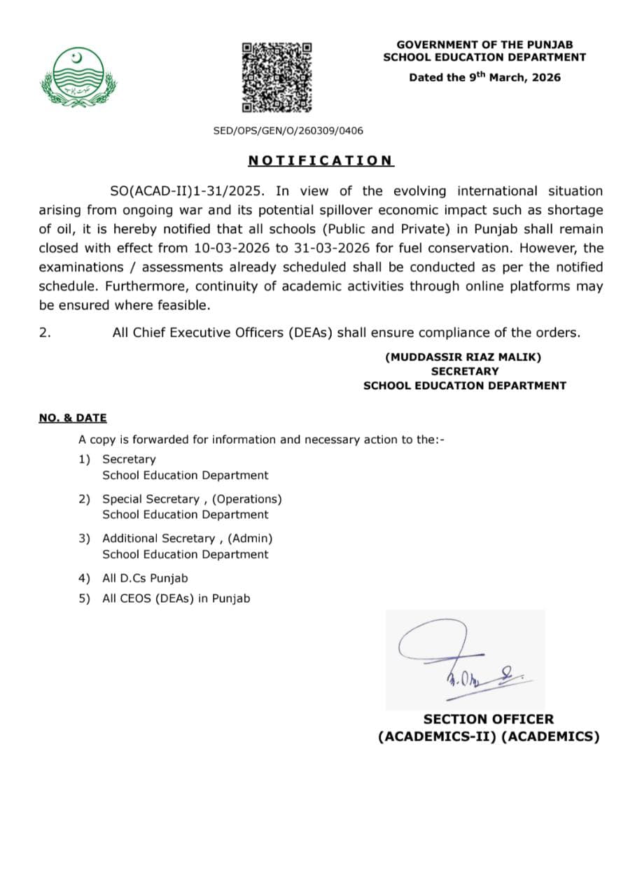 According to official notifications issued by the School Education Department Punjab and the Higher Education Department Punjab, all campuses across the province will remain closed during this period.